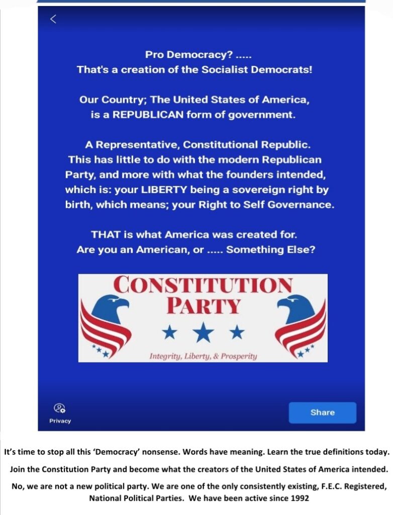 The solution becomes clear, in that; ‘politics as usual’ isn’t working. A government that runs it’s people is not what we need. We need the Opposite. We The People are to run the government, free from ‘politics’ & ‘politicians’. There is a nationwide organization that exists, that is replacing ‘politics’ with Public Service, and replacing ‘politicians’ with Public Servants. It is growing in its popularity throughout the country. It believes in Constitutional Law Abiding Governance as the only true way that government should function as. ….. and it’s simply called; ….. The Constitution Party. A so-called ‘political’ party that is more in tune with being a Public Service party than a political one. An organization dedicated to the principles of good government, functioning by, of, & through the Liberty of it’s people, and Nothing Else. We are not ‘brand new’ …. we have been doing this since 1992. If you want Public Service instead of politics, and want to vote for Public Servants to hold office, instead of politicians, then understand that the Democrat & Republican Parties are not your choice anymore. You belong with the Constitution Party, where we believe in ” Principle over Politics, because Freedom is Worth the Fight! “